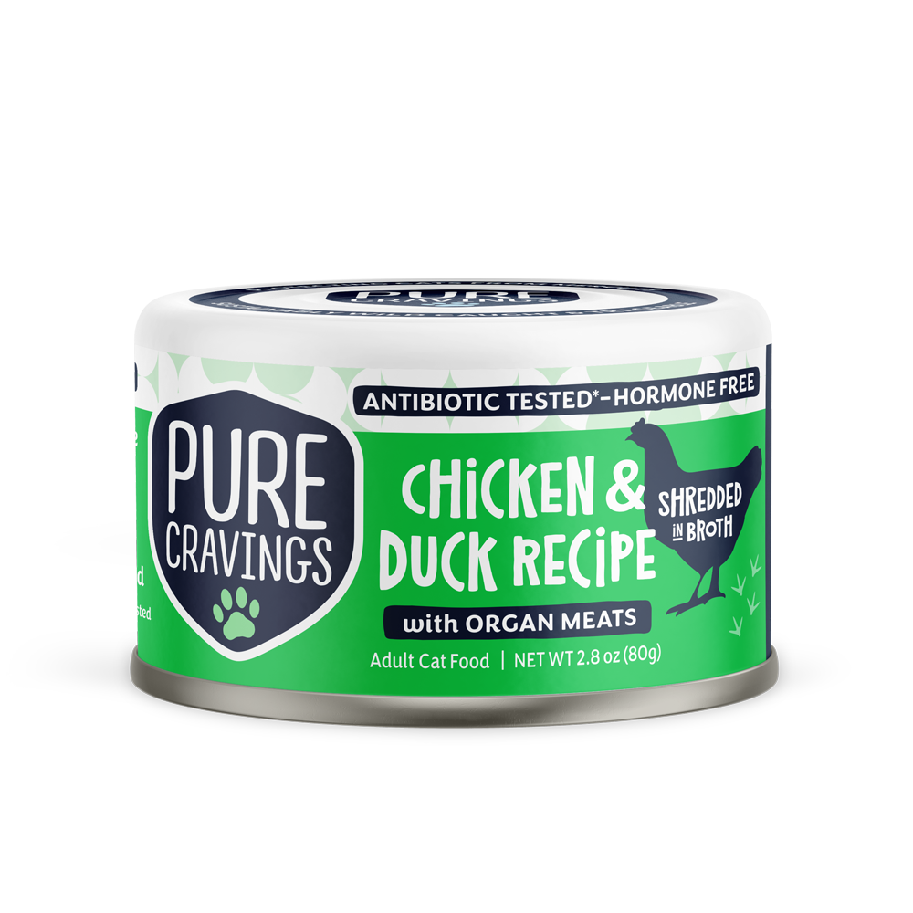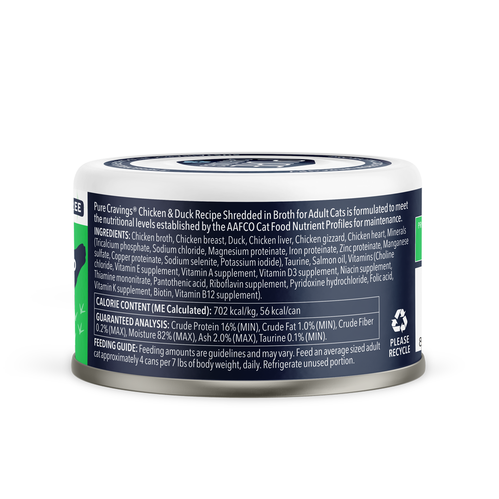 Chicken broth, Chicken breast, Duck, Chicken liver, Chicken gizzard, Chicken heart, Minerals (Tricalcium phosphate, Sodium chloride, Magnesium proteinate, Iron proteinate, Zinc proteinate, Manganese sulfate, Copper proteinate, Sodium selenite, Potassium iodide), Taurine, Salmon oil, Vitamins (Choline chloride, Vitamin E supplement, Vitamin A supplement, Vitamin D3 supplement, Niacin supplement, Thiamine mononitrate, Pantothenic acid, Riboflavin supplement, Pyridoxine hydrochloride, Folic acid, Vitamin K supplement, Biotin, Vitamin B12 supplement).