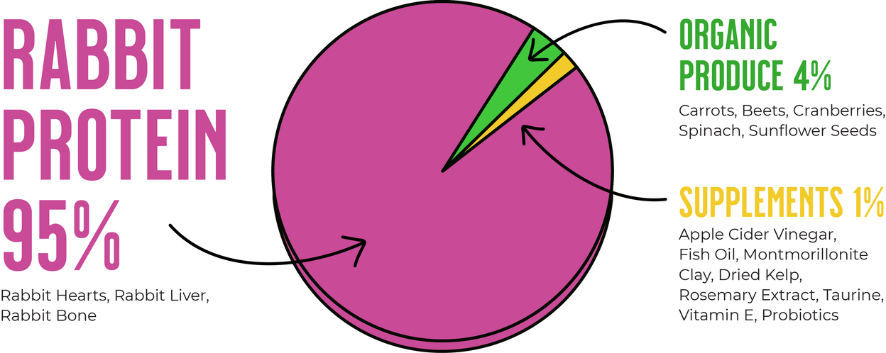Rabbit (with ground bone), Rabbit Livers, Organic Carrots, Organic Beets, Rabbit Hearts, Organic Cranberries, Organic Spinach, Organic Sunflower Seeds, Organic Apple Cider Vinegar, Fish Oil, Montmorillonite Clay, Dried Organic Kelp, Organic Rosemary Extract, Taurine, Vitamin E, Dried Bacillus Coagulans Fermentation Product (probiotic)