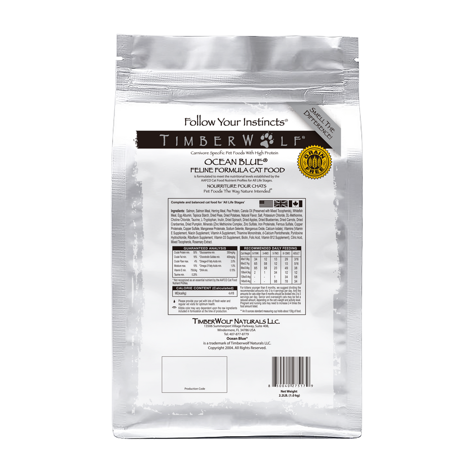 Timberwolf Ocean Blue Salmon for Cats food packaging with nutrient information and ingredients list.